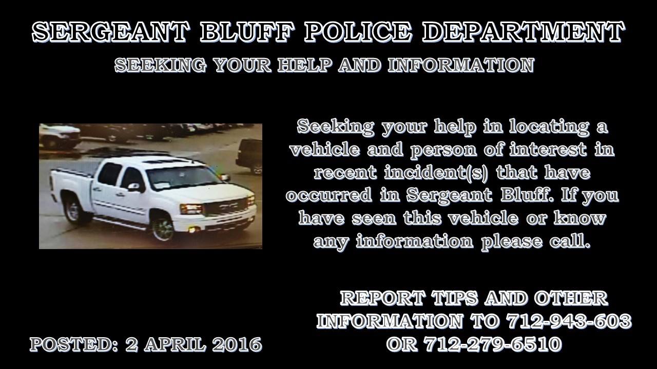 The Sergeant Bluff Police Department is seeking your help and information in locating a vehicle and person of interest in recent incident(s) that have occurred in the City of Sergeant Bluff. The vehicle pictured is believed to be a GMC truck that may have had paper plates at the time the image was taken and may have recently been purchased. We ask anyone with information to please call Officer Ebner or Officer Ward at 712-279-6510 after normal business hours and 712-943-9603 during normal business hours. Thank you for your help and any information you can provide.